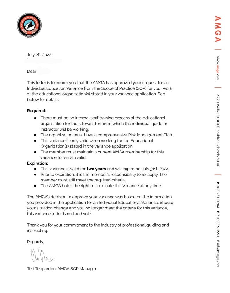 When the scope of practice was implemented we had several of our guides apply for a variance in 2022 which is a process that allows our instructors and guides to teach without certification, with certain expectations. The first expectation was that we were an educational entity. Check. The next was our organization has annual training for the specific terrain they will be working in (which up to this point is all single pitch for the majority of our team). We put on an annual rope skills training/refresher pre season for our rock guides and training rock guides every year. The second expectation is that we have a risk management plan in place. We have been operating for over 3 years: of course we also have that. Beyond that this individual can only use this variance for the entity they put on the application as well as maintain their AMGA $120 annual membership.