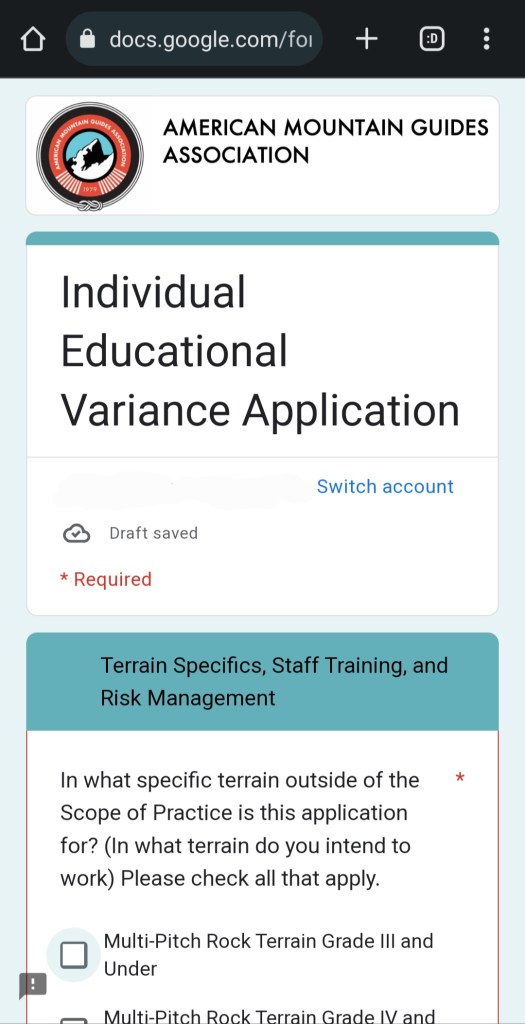 The guides who applied from our organization were granted their variance no problem, as it should be. They applied through an Individual Educational Variance application. And it expires in 2 years. There are 3 ways to apply for a variance: “Individual Educational, Bridge, and “Other”.18 They changed the requirements on the Individual Variance application.19