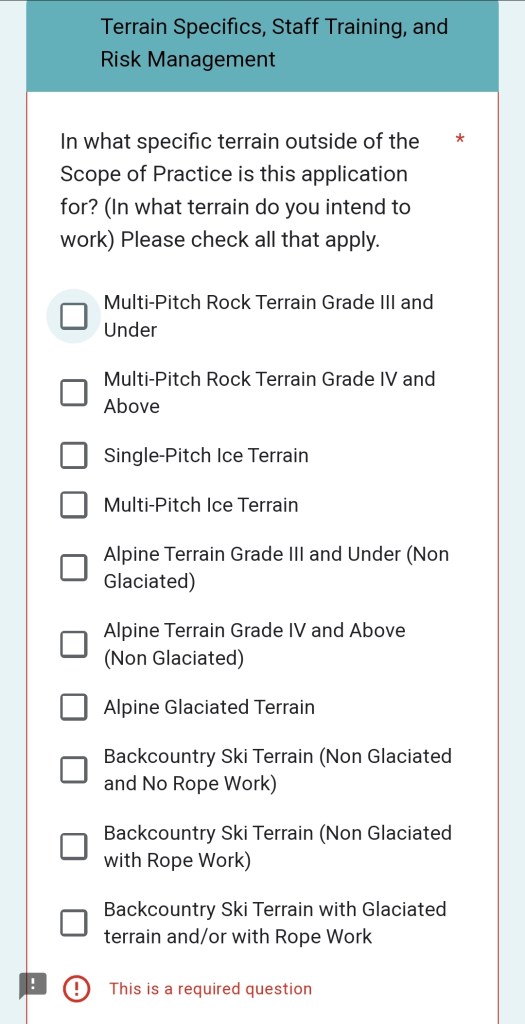 In July of 2022 the AMGA enforced the scope of practice (SOP) policy.14 This new policy stipulates what type of terrain guides can teach based on their AMGA certifications, as we have talked about previously. It has gone through a few inconsistent revisions for applying for a variance though. First let’s define some terms from the document itself. “Instructor: An individual who has passed the…Single Pitch Instructor Assessment”,15 which means the SPI course AND exam. In this document, referring to a Single Pitch Instructor implies they have taken and passed both. “Single Pitch Instructors…can work Unsupervised in this [up to Grade I] terrain…Graduates of the Single Pitch Instructor Course or Alpine Skills Course can work under the Supervision of a Single Pitch Instructor, Multi-Pitch Instructor, Rock Instructor, Rock Guide, IFMGA Guide, or Tenured Guide.”16 A resource a lot of affinity groups may not have access to. Which leads us right back to having to take the SPI course and exam. But there is an out: “Professional members, accredited businesses, or outdoor education organizations may anticipate situations in advance where working outside the SOP is difficult to avoid. The AMGA will consider issuing a variance to the member, or accredited business, so that, in defined situations, work outside of the SOP is permissible.”17 This policy has not changed since 2022: it is the application process which has changed. This is an important distinction to make: policy is implemented by processes and applications. A change has taken place somewhere between 2022 and 2023.