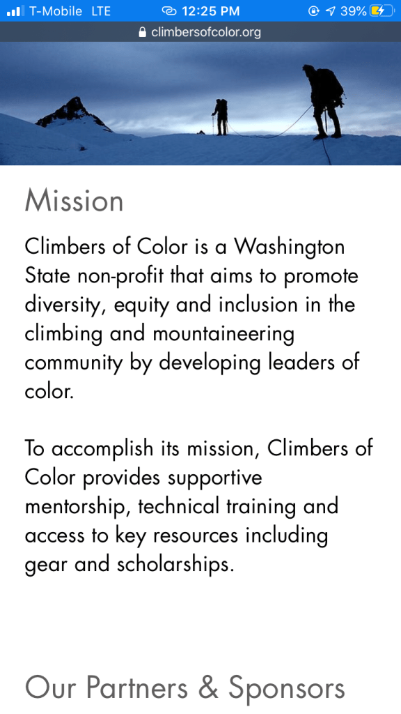 Therefore, in 2020 CoC had an established mission and was acting on it. The mission on the website7 at the time read as such: “Climbers of Color is a Washington State non-profit that aims to promote diversity, equity and inclusion in the climbing and mountaineering community by developing leaders of color. To accomplish its mission, Climbers of Color provides supportive mentorship, technical training and access to key resources including gear and scholarships.”