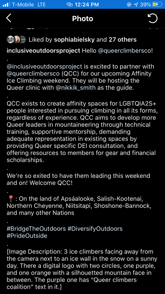 “QCC exists to create affinity spaces for LGBTQIA2S+ people interested in pursuing climbing in all its forms, regardless of experience. QCC aims to develop more Queer leaders in mountaineering through technical training, supportive mentorship, demanding adequate representation in existing spaces by providing Queer specific DEI consultation, and offering resources to members for gear and financial scholarships.” This was a more expanded version of their mission statement, however, upon investigation on the Inclusivity Outdoors Project website8 (no longer available for viewing as the page has been edited), the exact same mission statement as CoC was present with “people of color” having basically been replaced by “LGBTQIA2S+” and/or “Queer”.