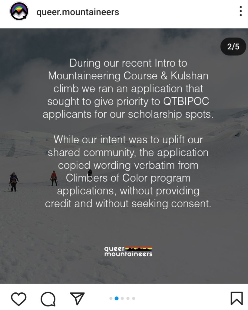 This article is going to take a look at the relationships of power and privilege across fellow affinity organizations, specifically the relationship between both Seattle based entities Climbers of Color and Queer Mountaineers2. As everyone has seen, there was a statement issued by the Queer Mountaineers discussing an issue with their white led and majority white participant organization plagiarizing an application form from Climbers of Color (see end of article for specific questions plagiarized). Let’s dive in to see why this is harmful not only to the individuals of color involved in the original application creation, but also the ripple effect on queer people of color as well as the general affinity space at large.