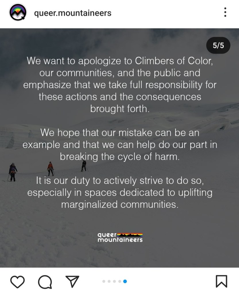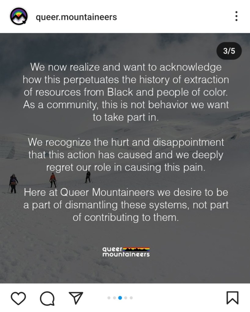 We now realize and want to acknowledge how this perpetuates the history of extraction of resources from Black and people of color. As a community, this is not behavior we want to take part in. We recognize the hurt and disappointment that this action has caused and we deeply regret our role in causing this pain. Here at Queer Mountaineers we desire to be a part of dismantling these systems, not part of contributing to them.