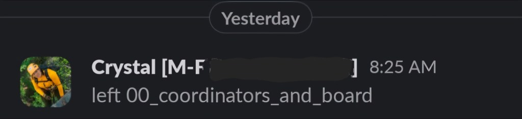 So let’s go back to right after I was excluded from the CoC board and why I decided to go public. It was around December 18th, 2023. CoC has an internal Slack with all leadership, coordinators, and volunteers able to access it. Naturally there are some private channels catered to certain leadership and coordinator positions. And I was on a leadership channel and another one with leadership and coordinators. I knew that I was no longer a part of the board and my new job description as Rock Team Instructor is neither leadership nor coordinator. I know what it’s like having to hunt down every channel that someone is on to remove them when their position changes, so I wanted to create as little ripples as possible on my exit. Although I did not agree with the outcome and was not happy about it, I was going to comply. I respect the organization too much to do anything else.