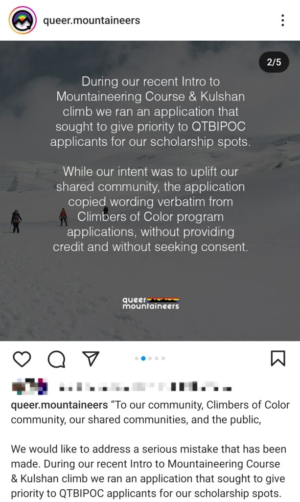 So 2023 I did put out a podcast and article about plagiarism, right? This is something that since then I’ve heard a lot of talk about amongst different affinity groups, specifically Black affinity groups with other groups taking their work, rebranding it but it’s still recognizable by that specific group, right? Now in this case, we’re talking about Climbers of Color and Queer Mountaineers. Queer Mountaineers had taken an application that I was actually one of the authors of, myself and another non-binary person, non-black non-binary person in climbers of color organization, originally wrote. And then every year we go back through and we also edit it as we learn, right?
