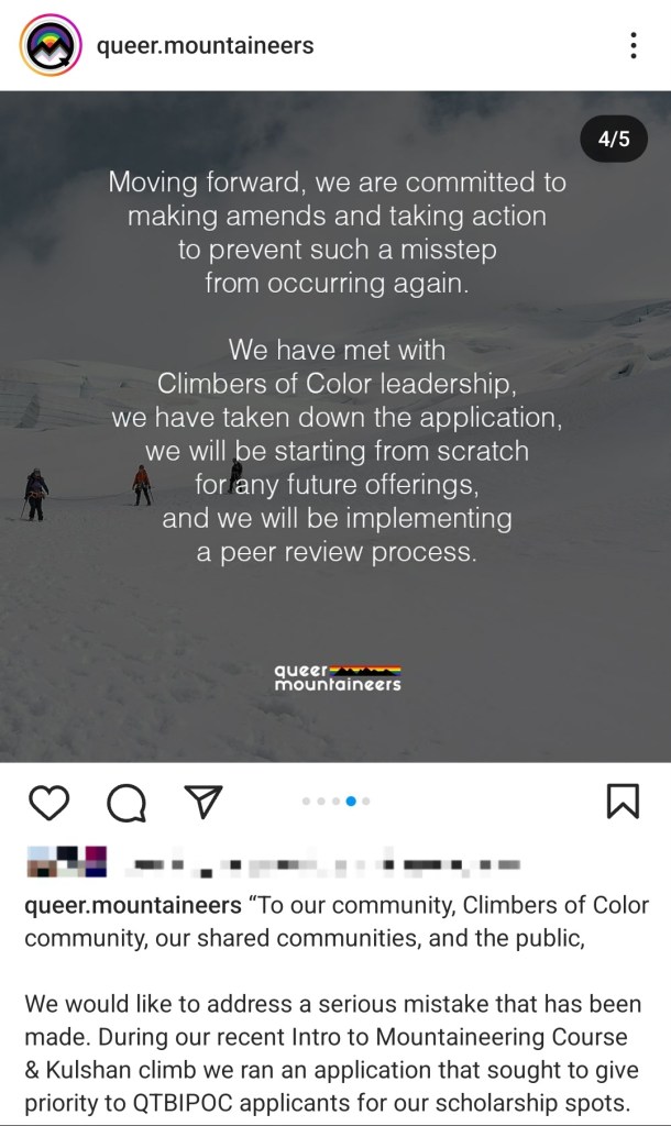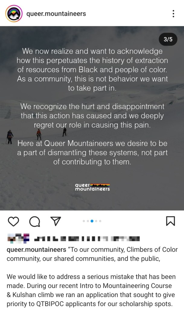 Now we have a relationship with Queer Mountaineers, one that we cherish, right, because they do important work. However, we did not give them permission to use this form or application, and they were specifically using it for, I believe, a scholarship for people of, queer people of color, to do a mountaineering trip, if I recall that correctly.