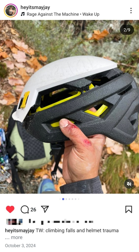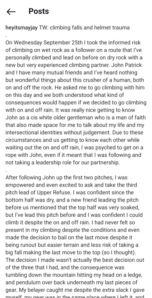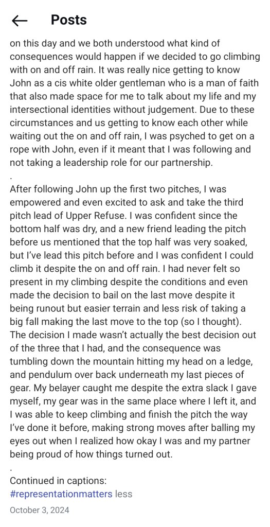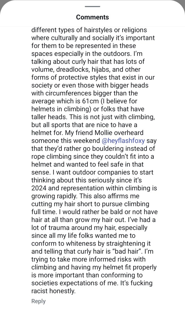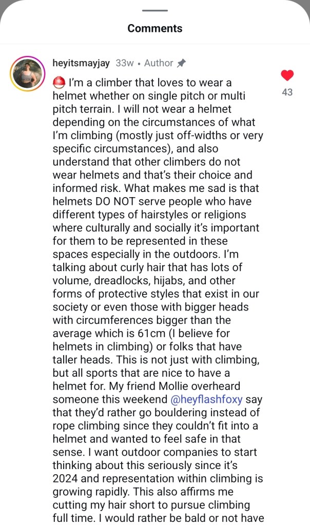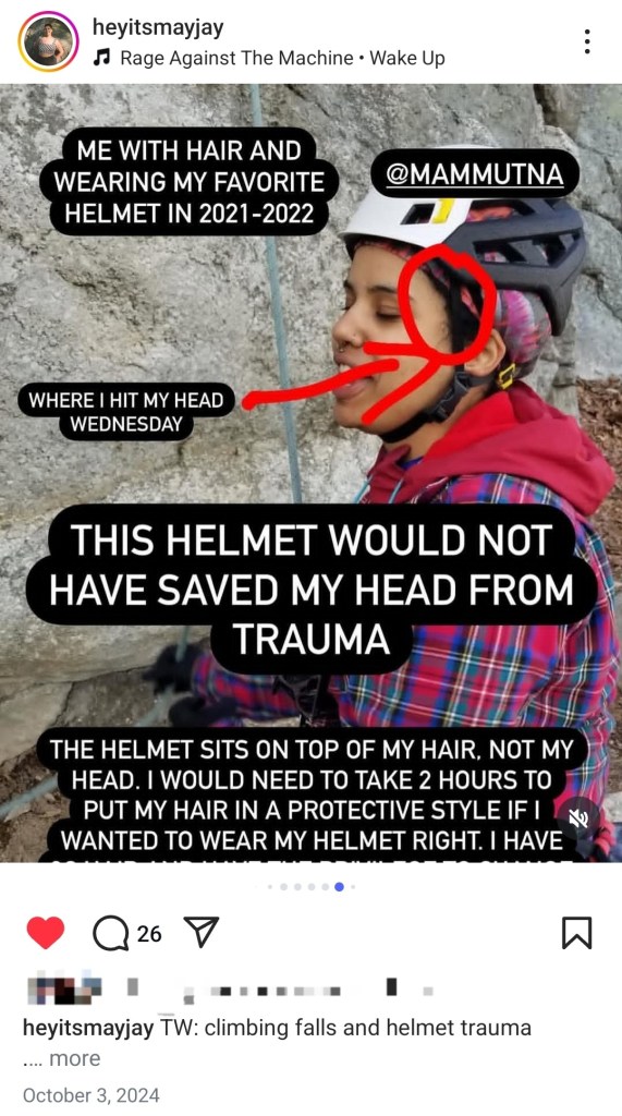 If you are not familiar: May Perez is a guide who is also the CEO and co-founder of Rise Outside Collective. Rise Outside Collective is an organization “dedicated to diversifying the outdoors.”46 May has spent a lot of time in the outdoor industry and in climbing. One day they had a climbing incident that involved a tumble. For this incident, their helmet did fit them in a way that made it function properly. However, they point out that where they did hit their head would not have been protected in the past when their hair was longer due to where the helmet sat because of the greater volume of hair.47 And this is the sad reality of anyone not fitting into that box of what a climbing helmet currently offers.