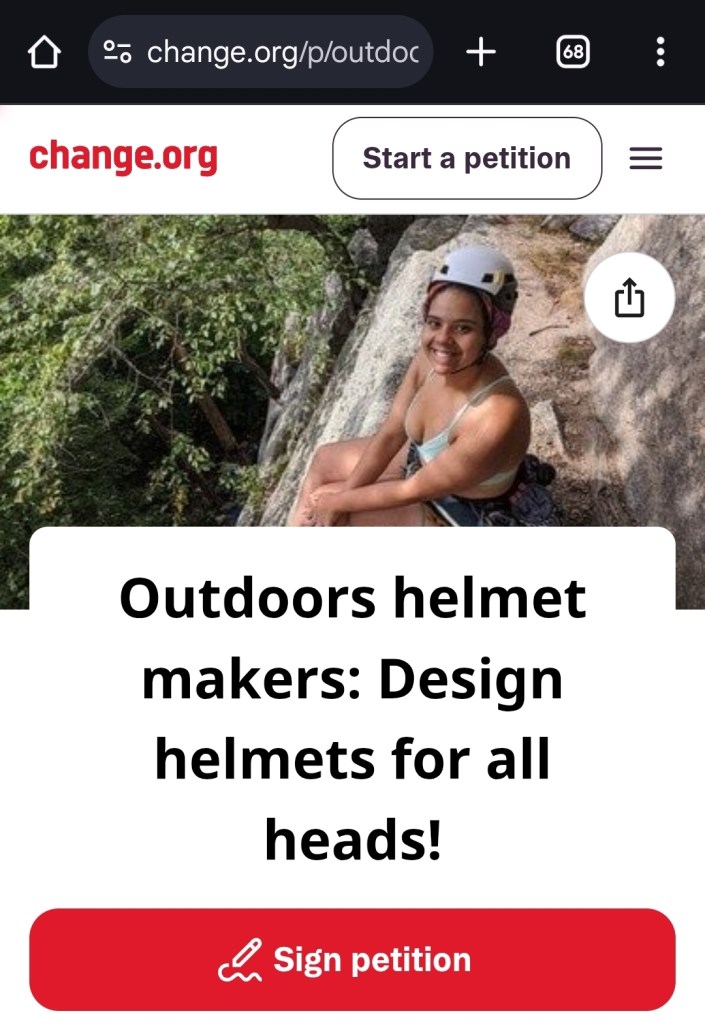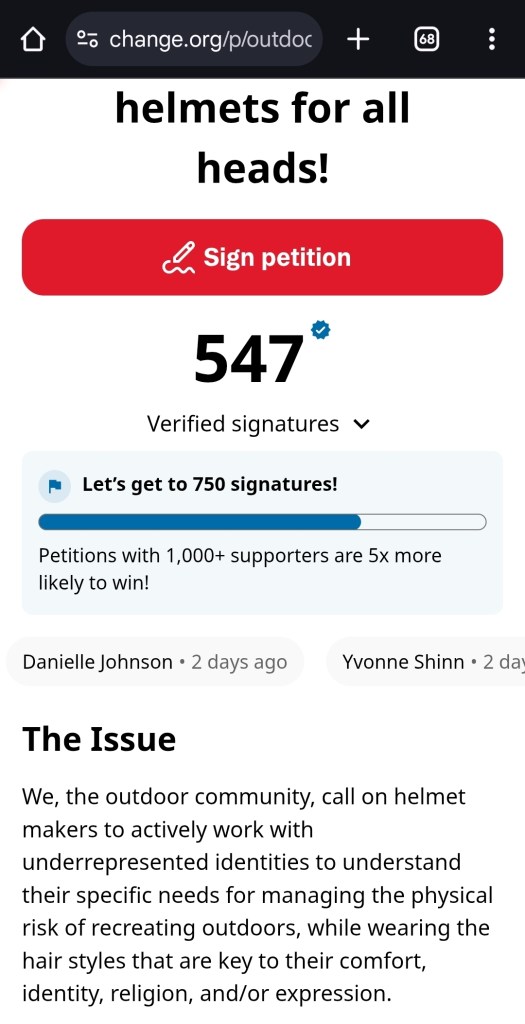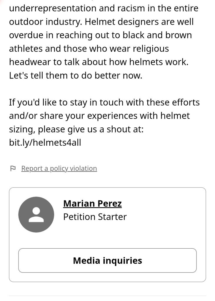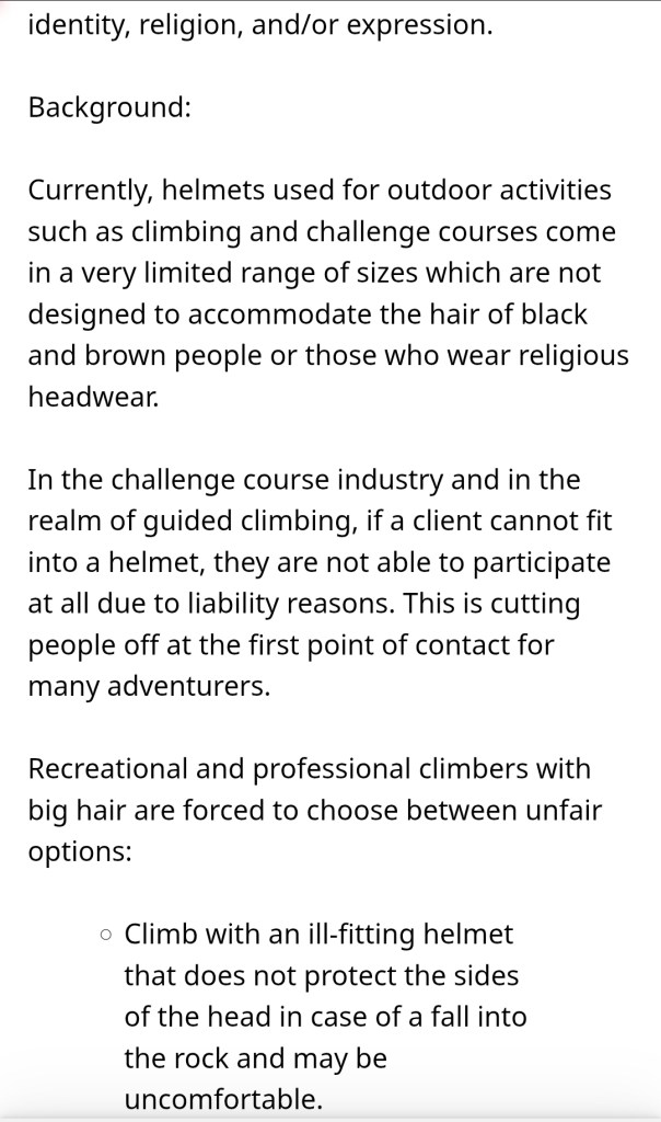 One brave soul has decided to do something about it in another way. May Perez of Rise Outside Collective has started a petition January of 2025 to “call on helmet makers to actively work with underrepresented identities to understand their specific needs for managing the physical risk of recreating outdoors, while wearing the hair styles that are key to their comfort, identity, religion, and/or expression.”52 It goes on to say: