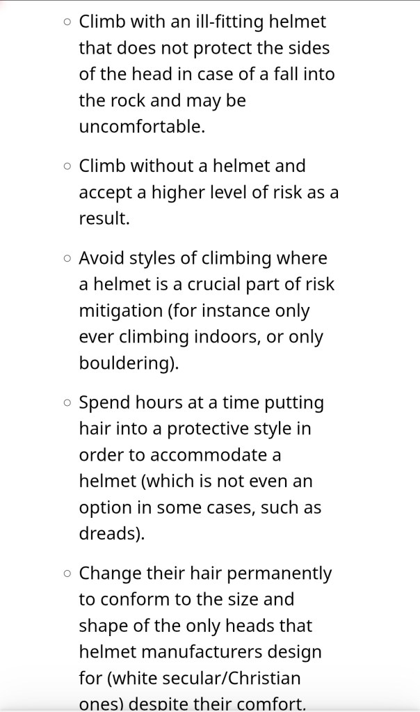 Beyond white approved presentability; conforming our hair to straight and/or low volume actually has the unintended effect of keeping us safer. BUT negatively. More specifically the incident described to me by Jaylynn Ayanna in Black Hair and Climbing: Part VI. The story they recounted about not being able to fit climbing helmets in an REI store is one I have heard many times. I myself have multiple helmets for my outdoor activities because my hair does change sizes, as many people with afro hair does or even people who wear hijabs or the like. The temptation to straighten hair to make it smaller is very great because if a helmet fits right, then we are safer.
