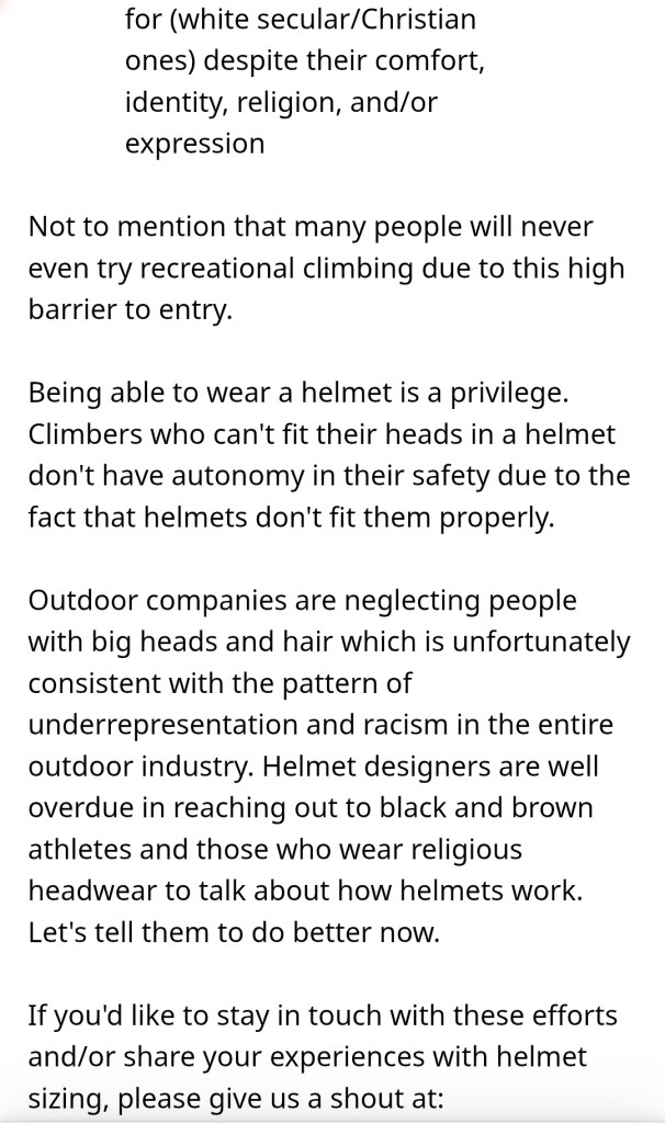 In the end I personally think the only thing that would truly grab their attention and inspire action would be a lawsuit. It would be a hard fought lawsuit with a potential to lose simply because they could chalk it up to user error, much like the McDonald’s hot coffee lawsuit. But the difference here is that industry wide we have little choice in well fitting helmets. “Being able to wear a helmet is a privilege. Climbers who can’t fit their heads in a helmet don’t have autonomy in their safety due to the fact that helmets don’t fit them properly.”53